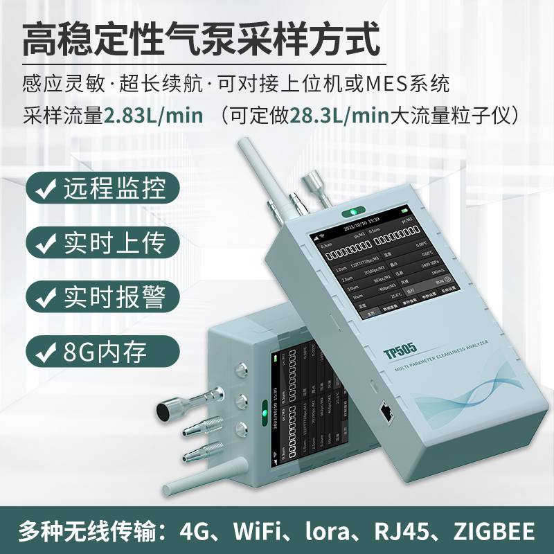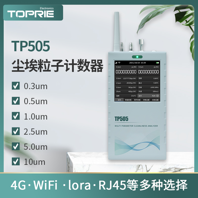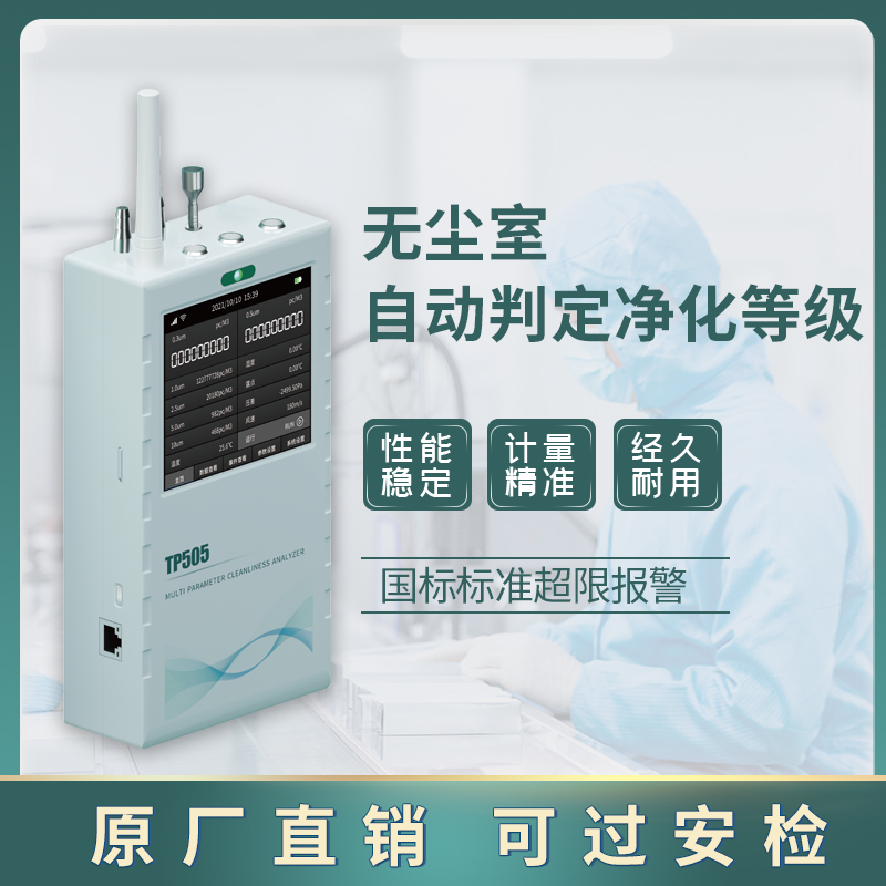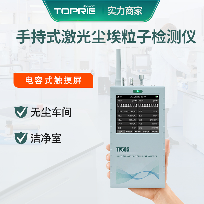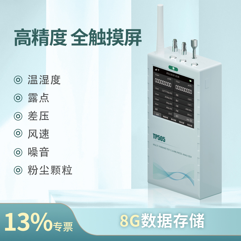 产品简介:TP505尘埃粒子计数器是业内首款在线式、手持式二合一的洁净度测试仪表; 集尘埃粒子、温湿度、压差、露点、温度、风速等6种可测参数、11个数值显示为一体 基本满足各种环境测试。
